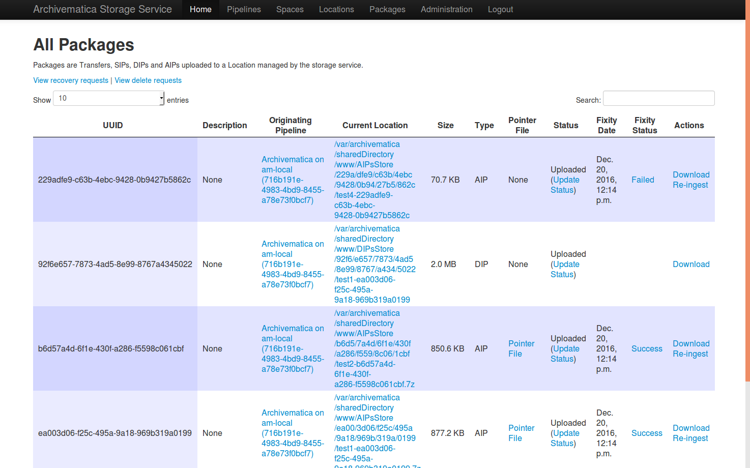 パッケージは、Archivematicaがストレージサービスに保存したファイルで、一般的にはアーカイブ情報パッケージ(AIP)です。保存された普及情報パッケージ(DIP)やバックログに送信された転送も、パッケージタブにリストされます。
