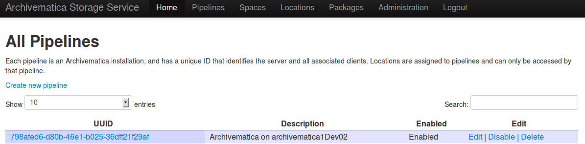 ArchivematicaのパイプラインとはArchivematicaダッシュボードのことです。全てのパイプラインは、その固有のユニバーサル識別子(UUID)を使ってストレージサービスに登録する必要があります。UUIDは、管理 -> 一般設定の下にあるArchivematicaダッシュボードで見つけることができます。Archivematicaを初めてインストールすると、Archivematica on <hostname> の説明と共にパイプラインのUUIDをストレージサービスに自動的に登録しようとします。