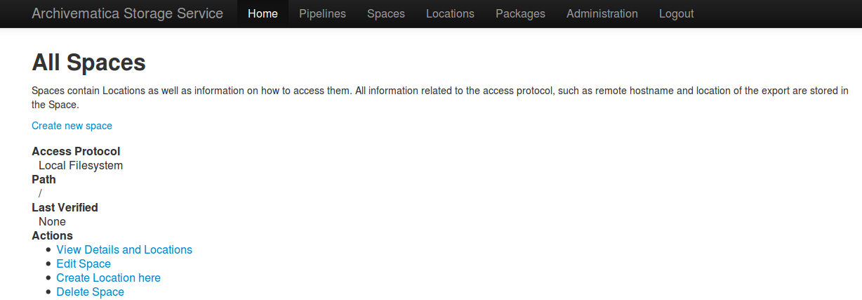 スペースは、Archivematicaをストレージロケーションに接続するために必要なすべての情報を含んでいます。スペースは、NFSエクスポートパスやホスト名、またはSSH経由でのみアクセス可能なシステムのユーザー名など、プロトコル固有の情報が保存される場所です。