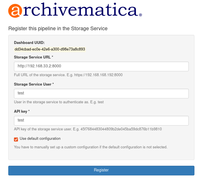 ストレージサービスが稼働している場合は、そのURLを提供し、ArchivematicaはダッシュボードのUUIDを新しいパイプラインとして登録しようとします。そうでない場合は、ダッシュボードのUUIDが表示され、Archivematicaインスタンス用のパイプラインを手動で作成し設定することができます。ダッシュボードのUUIDは、Archivematicaの「管理 -> 一般」の下でも利用可能です。