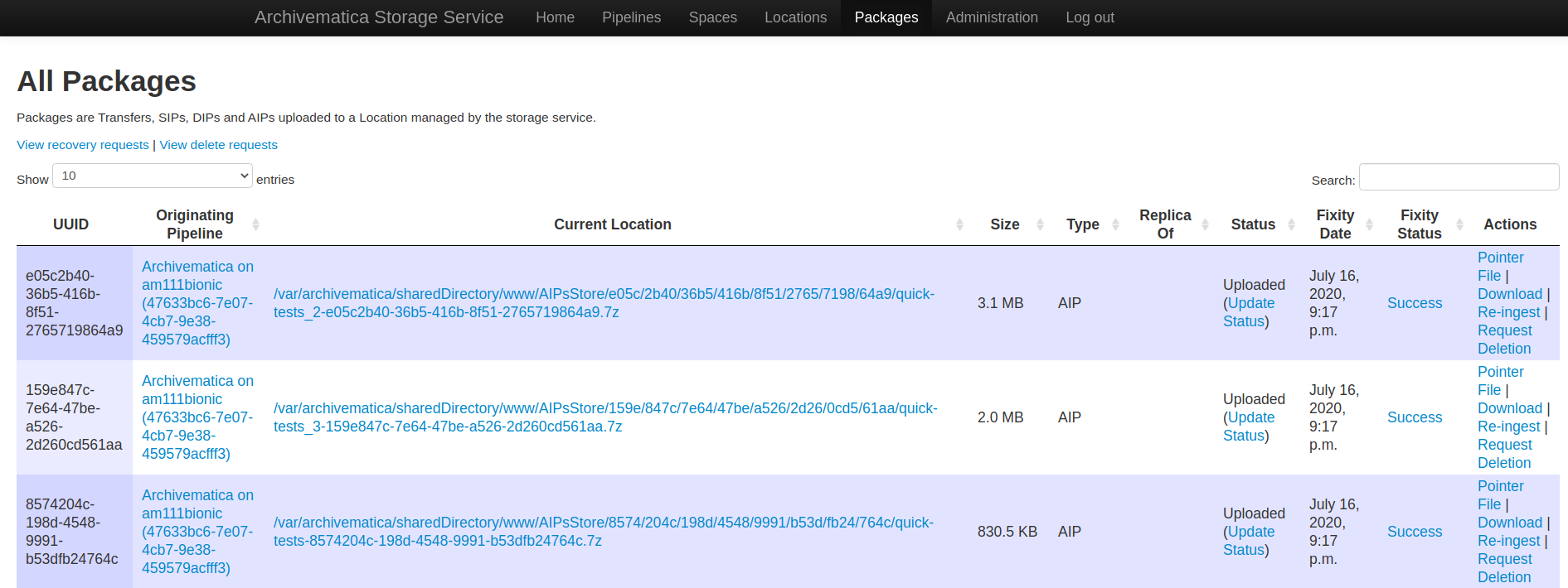 fixityチェックの結果はストレージサービスに書き戻され、ユーザインタフェースのパッケージタブにある**Fixity Date**と**Fixity Status**の列で表示されます。